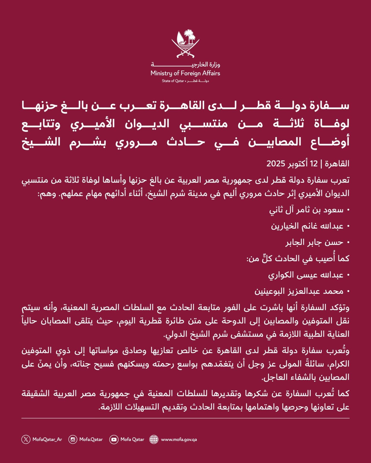 أصدرت سفارة دولة قطر لدى جمهورية مصر العربية بيانًا رسميًا أعربت فيه عن بالغ الحزن والأسى لوفاة 3 من منتسبي الديوان الأميري في حادث انقلاب سيارة بمدينة شرم الشيخ.