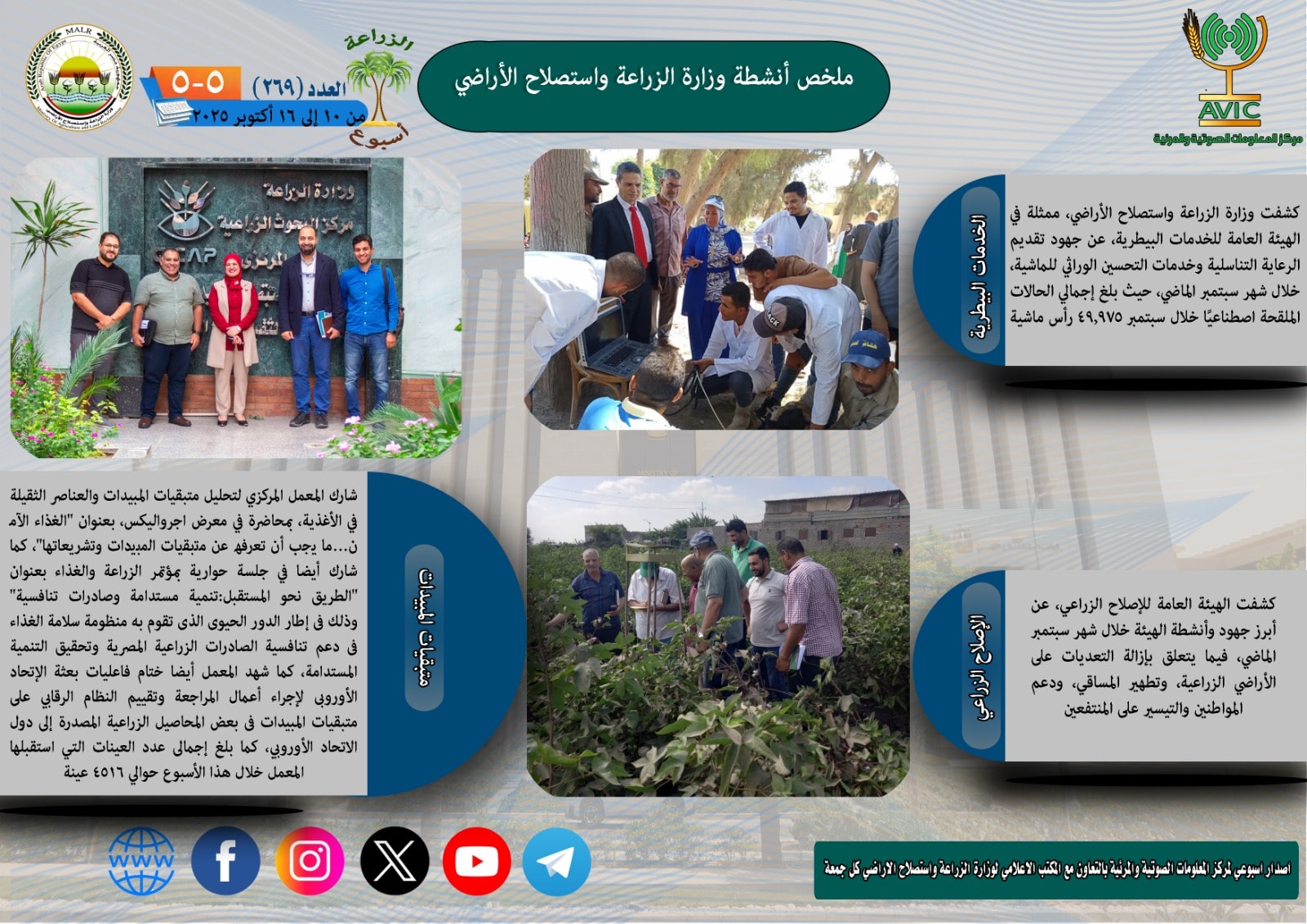 أصدر مركز المعلومات الصوتية والمرئية بوزارة الزراعة واستصلاح الأراضي، “الانفوجراف الاسبوعي” في نسخته رقم 269 حول الحصاد الاسبوعي لأهم أنشطة الوزارة، خلال الاسبوع الماضي في الفترة من 10 وحتى 16 أكتوبر الجاري، كما أصدر المركز ايضا ملخصا بالفيديو، حول انشطة الوزارة خلال نفس الفترة.