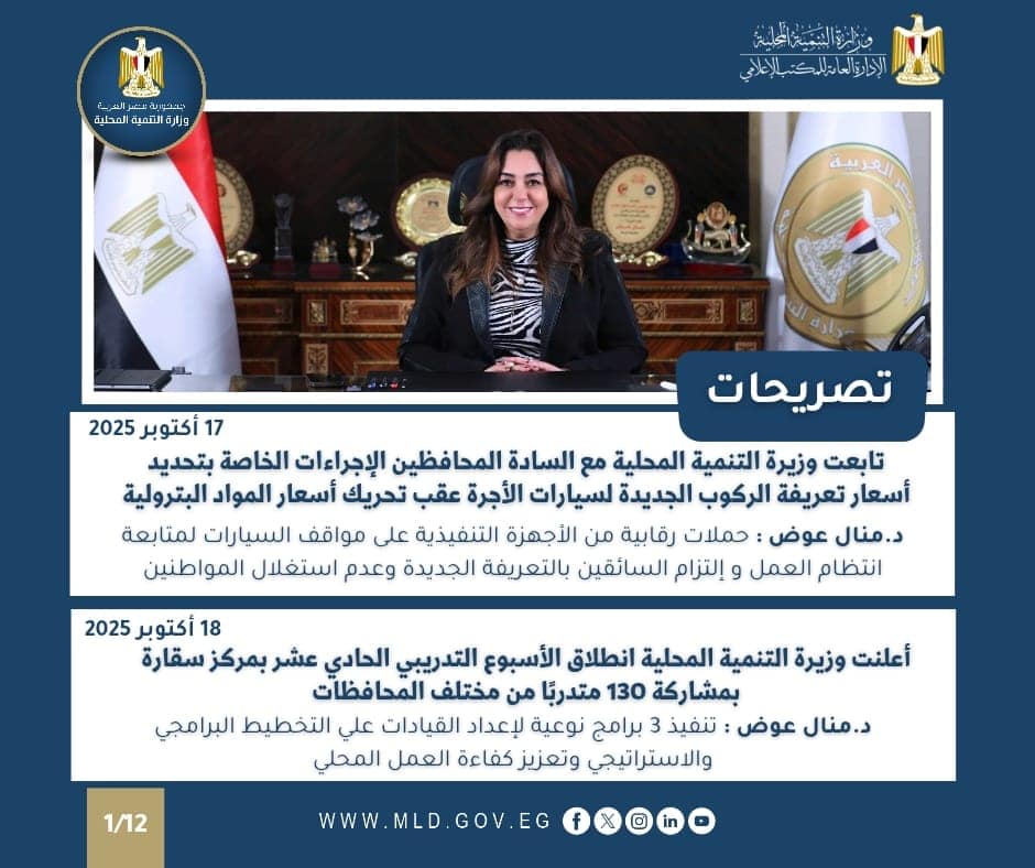 تابعت الدكتورة منال عوض وزيرة التنمية المحلية ، مع السادة المحافظين الإجراءات التي تم اتخاذها لتحديد أسعار تعريفة الركوب الجديدة لجميع المواصلات العامة الخطوط الداخلية والخارجية ( سيارات الميكروباص و السرفيس والنقل الجماعي ) وذلك عقب قرار لجنة التسعير التلقائي للمنتجات البترولية بزيادة أسعار البنزين والسولار اعتباراً من 17 – 10 – 2025 .
