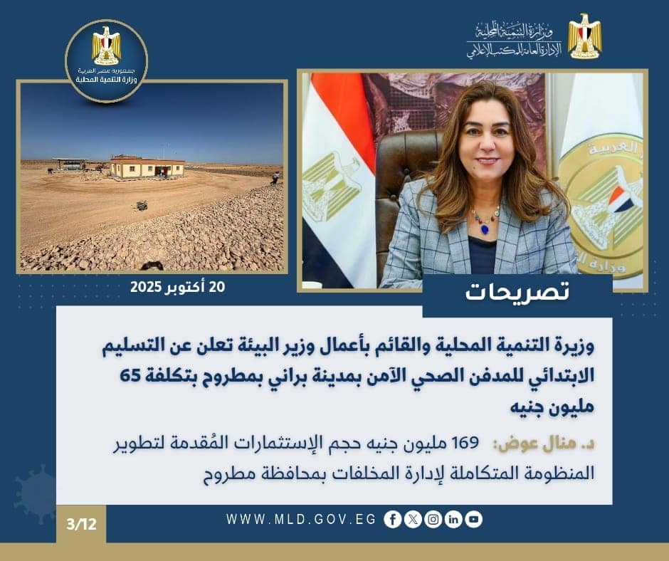 أعلنت الدكتورة منال عوض، وزيرة التنمية المحلية والقائم بأعمال وزير البيئة، عن التسليم الابتدائي للمدفن الصحي الآمن بمدينة براني بمحافظة مطروح بتكلفة ٦٥ مليون جنيه ، من خلال اللجنة المشكلة المختصة بتسيير ومتابعة واستلام أعمال مشروعات البنية التحتية لضمان تنفيذ جميع بنود الأعمال الواردة بعقود مراحل البنية الأساسية لمنظومة المخلفات بالمحافظات، وذلك في إطار تنفيذ توجيهات السيد رئيس الجمهورية وتكليفات رئيس مجلس الوزراء، بشأن الإسراع في تنفيذ المنظومة المتكاملة لإدارة المخلفات البلدية الصلبة بمختلف محافظات الجمهورية.