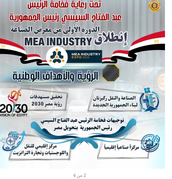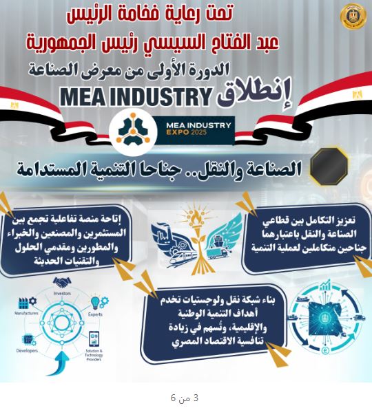 تحت رعاية فخامة الرئيس عبد الفتاح السيسي رئيس الجمهورية تنطلق غداً الأحد الموافق 9 نوفمبر فعاليات معرض ومؤتمر الصناعة والنقل معاً لتحقيق التنمية المستدامة (الدورة الأولى من معرض الصناعة MEA Industry بالتزامن مع الدورة السادسة من معرض ومؤتمر النقل الذكي واللوجستيات TransMEA) وتستمر فعاليات المعرض حتى 11 نوفمبر الجاري.