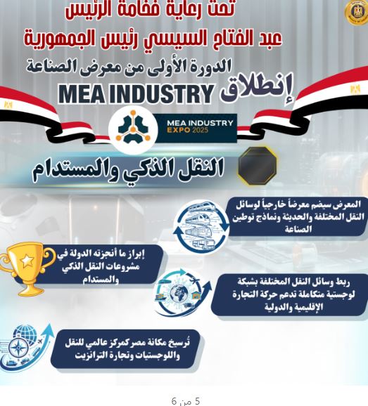 6. تنظيم هذا المعرض يأتي في توقيت بالغ الأهمية، حيث تشهد الدولة نهضة غير مسبوقة في مجالي التصنيع المحلي والبنية التحتية للنقل خاصة وان الصناعة اليوم أصبحت محوراً رئيسياً لزيادة معدلات النمو، وتعميق التصنيع المحلي، وتحقيق الاكتفاء الذاتي، ورفع تنافسية الصادرات المصرية وفي الوقت نفسه، تمثل منظومة النقل بمختلف قطاعاتها من النقل الأخضر المستدام الصديق للبيئة والسكك الحديدية والطرق والكباري والموانئ البحرية والبرية والجافة والمناطق اللوجستية والنقل النهري شرياناً رئيسياً يدعم هذه النهضة ويُسهم في تسهيل حركة التجارة والاستثمار.