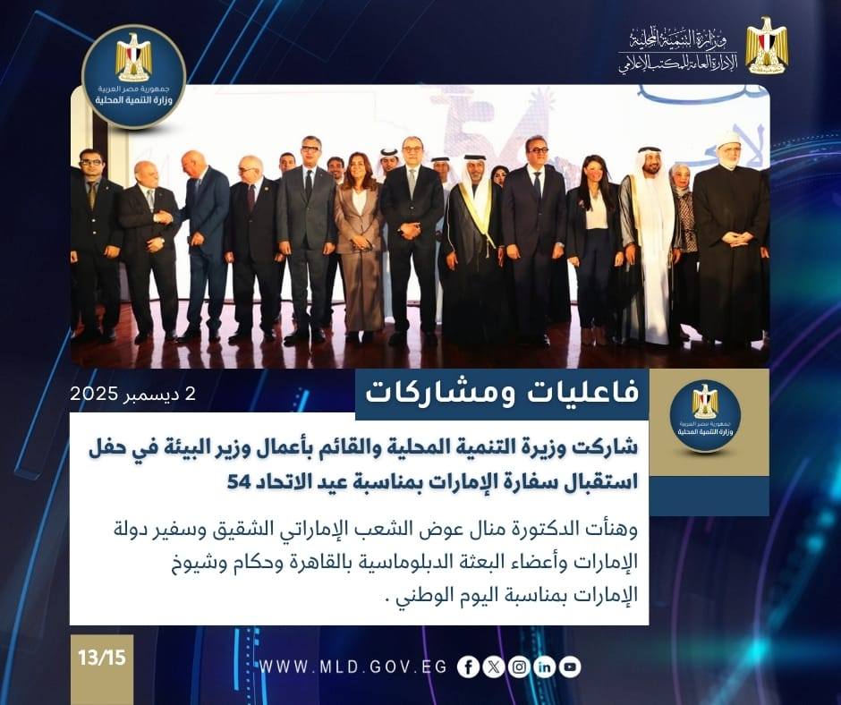 كما شاركت الدكتورة منال عوض وزيرة التنمية المحلية والقائم بأعمال وزير البيئة، في حفل الاستقبال الذي أقامته سفارة دولة الإمارات العربية بجمهورية مصر العربية، بمناسبة عيد الاتحاد الـ54، بالعاصمة الجديدة، وذلك بحضور حمد الزعابي، سفير دولة الإمارات لدى القاهرة، ومندوبها الدائم لدى جامعة الدول العربية، وعدد من السادة الوزراء و المحافظين والسفراء والإعلاميين وكبار الشخصيات.