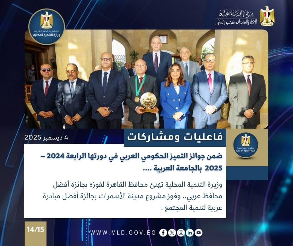 وهنأت الدكتورة منال عوض وزيرة التنمية المحلية والقائم بأعمال وزير البيئة ، الدكتور إبراهيم صابر محافظ القاهرة بمناسبة فوزه بجائزة أفضل محافظ عربي ضمن جوائز التميز الحكومي العربي في دورتها الرابعة 2024 – 2025 .