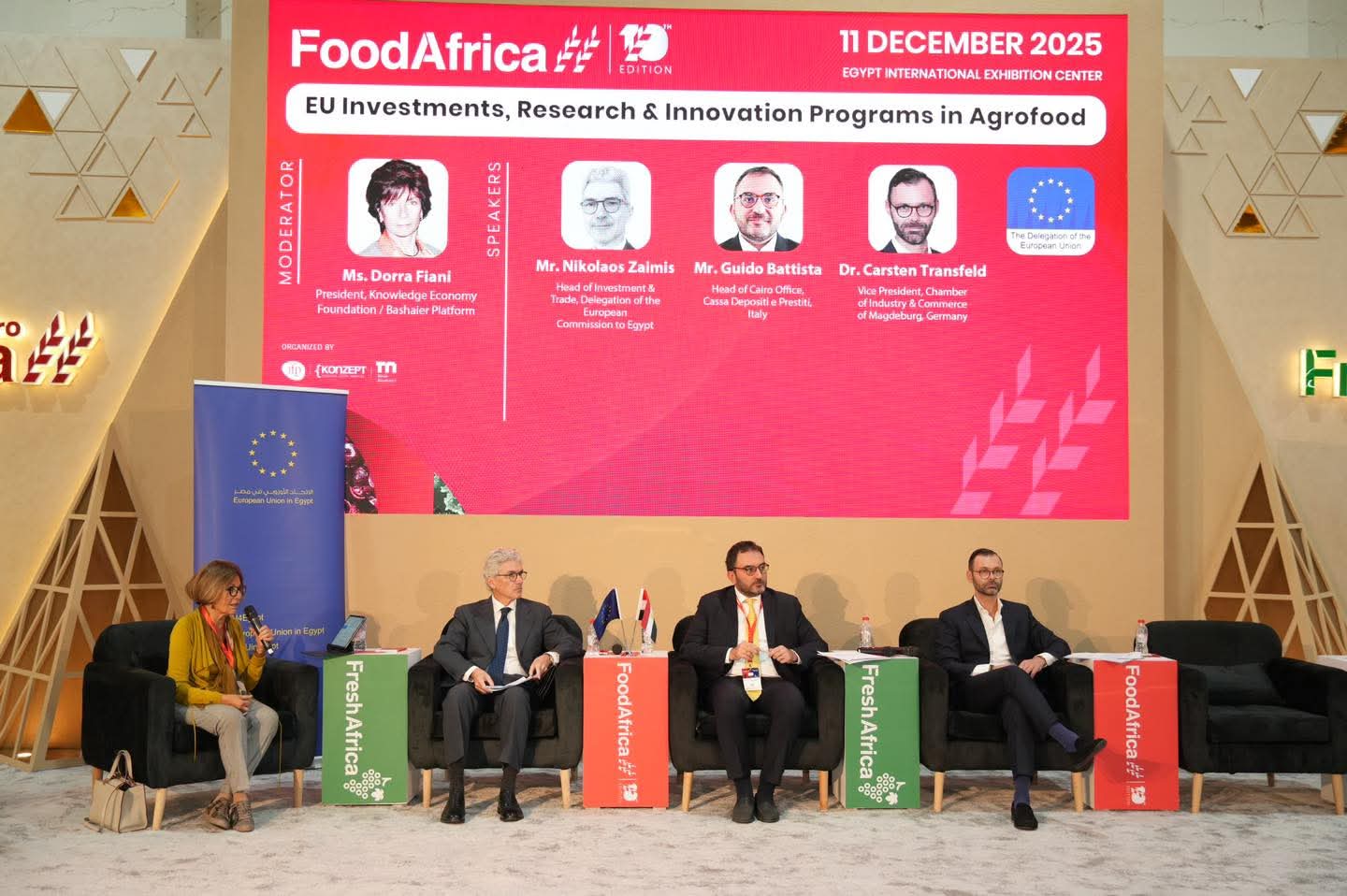 وقد عقدت الجلسة تحت عنوان ” برامج الاستثمار والبحث والابتكار الأوروبية في الأغذية والزراعة “، شارك فى الجلسة كل من السيد. نيكولاوس زيميس، رئيس قسم الاستثمار والتجارة، ببعثة الاتحاد الأوروبي بمصر، والسيد جويدو باتيستا، رئيس مكتب القاهرة، كاسا ديبوزيتي إي بريستيتي، إيطاليا ، والدكتور. كارستن ترانسفيلد، نائب رئيس غرفة الصناعة والتجارة في ماجديبورغ، بألمانيا ، أدارت الجلسة السيدة .دورا فياني، رئيسة، مؤسسة اقتصاد المعرفة / منصة بشاير.