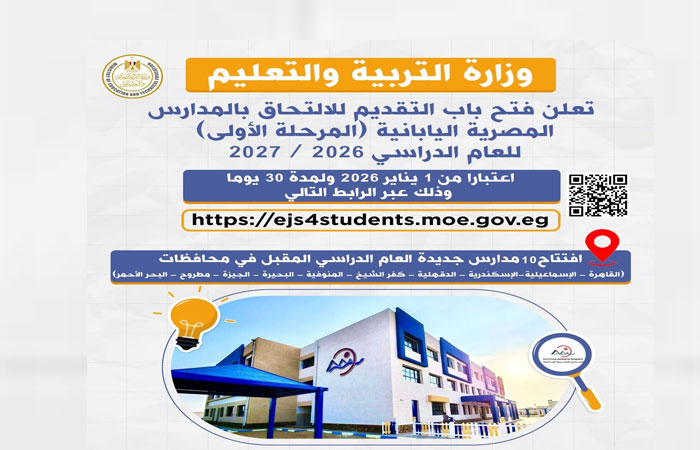 كما تعلن وزارة التربية التعليم فتح باب التقديم للطلاب في جميع المدارس المصرية اليابانية بمختلف محافظات الجمهورية، للعام الدراسي 2026 / 2027، وذلك بداية من غد الخميس الموافق 1 يناير 2026 ولمدة شهر، وذلك من خلال الرابط التالي: