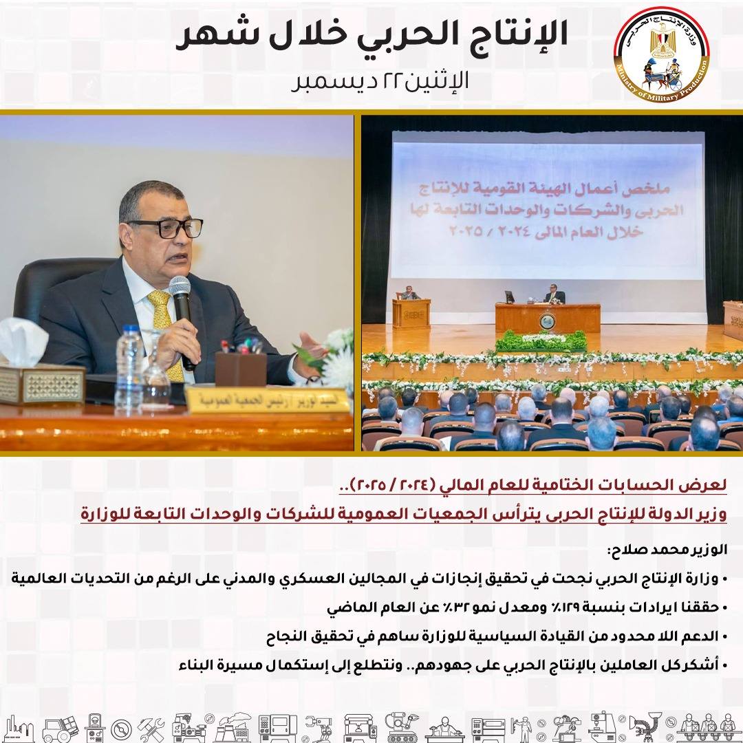 وزير الدولة للإنتاج الحربى يترأس الجمعيات العمومية للشركات والوحدات التابعة للوزارة