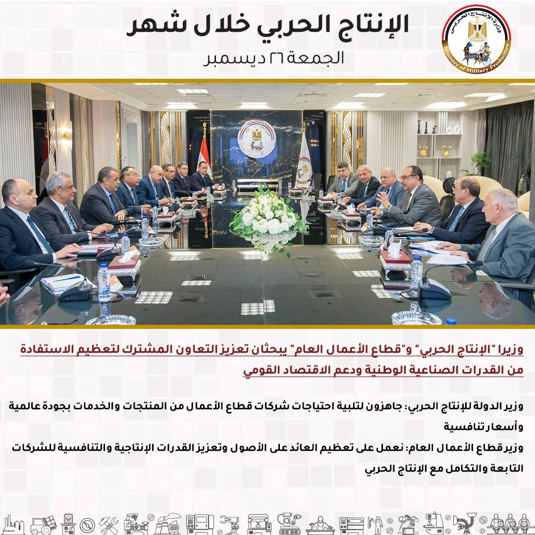 -وزيرا “الإنتاج الحربي” و”قطاع الأعمال العام” يبحثان تعزيز التعاون المشترك لتعظيم الاستفادة من القدرات الصناعية الوطنية ودعم الاقتصاد القومي