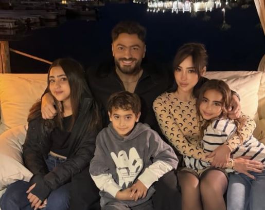وظهرت بسمة بوسيل مع ابنائها والفنان تامر حسني احتفالا بالعام الجديد.