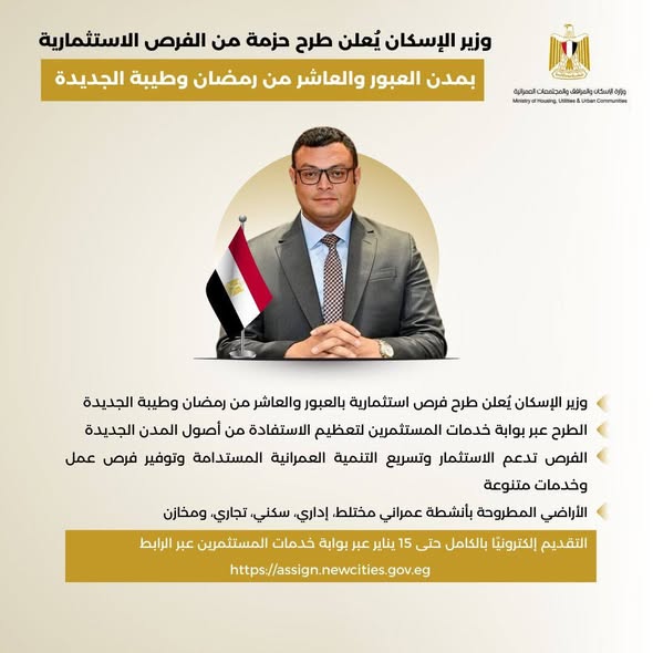 أعلن المهندس شريف الشربيني، وزير الإسكان والمرافق والمجتمعات العمرانية، عن طرح حزمة جديدة من الفرص الاستثمارية المتنوعة من قطع الأراضي بمدن العبور والعاشر من رمضان وطيبة الجديدة عبر بوابة خدمات المستثمرين الإلكترونية لهيئة المجتمعات العمرانية الجديدة حتى 15 يناير الجاري.