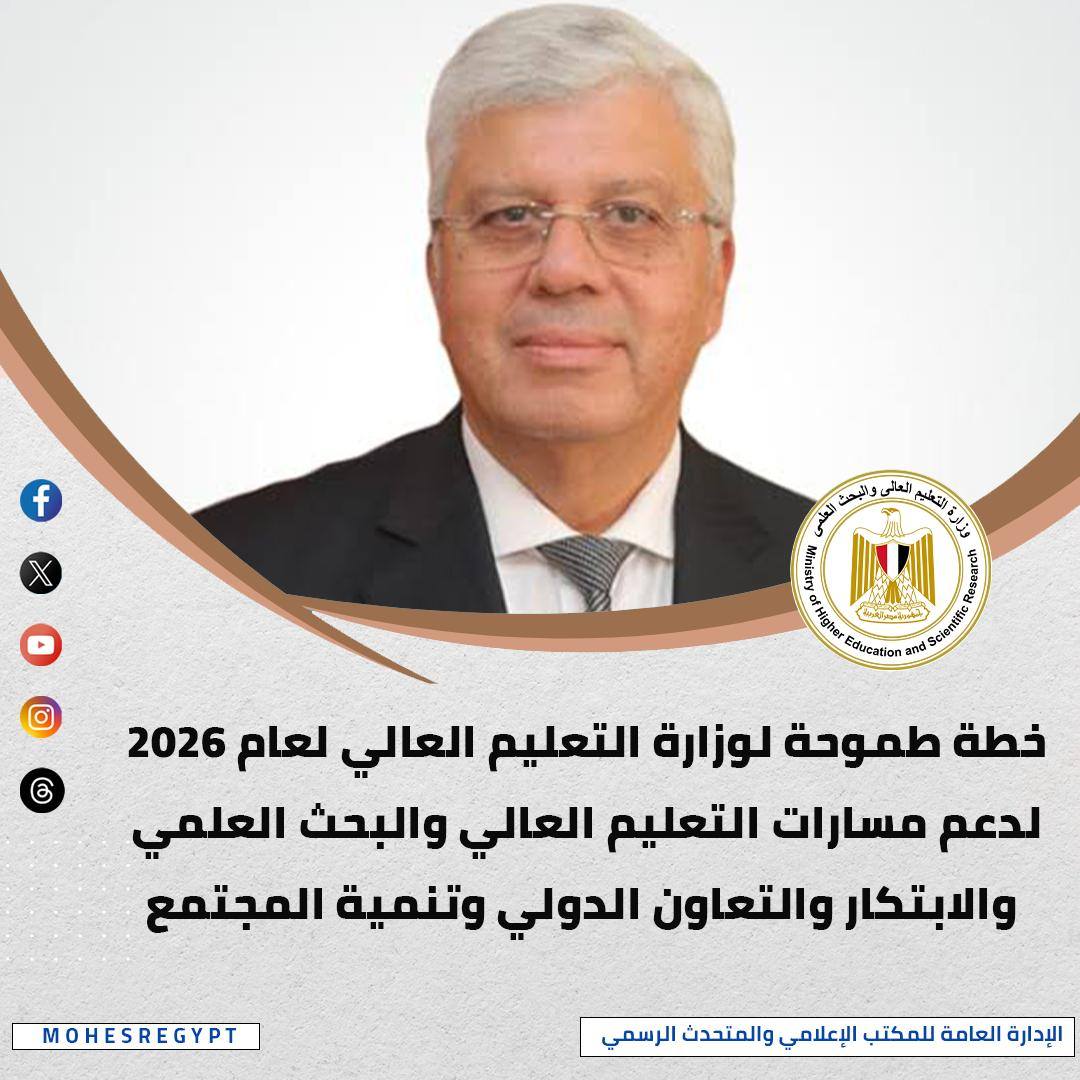 أطلق الدكتور أيمن عاشور وزير التعليم العالي والبحث العلمي، خطة الوزارة لعام 2026 وتتضمن تنفيذ العديد من المشروعات التي تستهدف الاستمرار في تطوير كافة جوانب العملية التعليمية في مصر، مشيرًا إلى أن هذه المشروعات تهدف إلى إيجاد منظومة تعليمية وبحثية متكاملة تواكب احتياجات مصر في مجالات التعليم العالي والبحث العلمي والابتكار، ويأتي ذلك في إطار تنفيذ الإستراتيجية الوطنية للتعليم العالي والبحث العلمي التي تتماشى مع رؤية مصر 2030، وهي رؤية شاملة تهدف إلى تعزيز دور التعليم العالي والبحث العلمي في دعم التنمية الاقتصادية والاجتماعية في مصر، وأشار الوزير إلى أن أولويات الوزارة لعام 2026 تتمثل في تعزيز الابتكار وريادة الأعمال وفق الإستراتيجية الوطنية للابتكار المستدام، وتحويل مصر إلى مركز إقليمي للابتكار، والتوسع في دعم الشركات الناشئة، وتحويل مخرجات البحث العلمي إلى منتجات ذات قيمة اقتصادية تخدم الاقتصاد الوطني، عبر التعاون بين الجامعات والجهات البحثية والمستفيدين، من خلال برامج ومبادرات الجهات التابعة للوزارة، مثل: هيئة تمويل العلوم والتكنولوجيا والابتكار، وأكاديمية البحث العلمي والتكنولوجيا، وصندوق رعاية المبتكرين والنوابغ، مع تعزيز مكانة مصر في البحث والابتكار كشريك كامل في برنامج هورايزون.