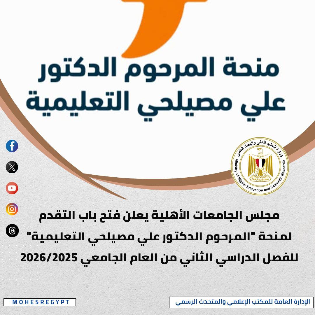 أعلن مجلس الجامعات الأهلية عن تقديم عدد من المنح التعليمية الممولة من الهيئة العامة لبنك ناصر الاجتماعي، ضمن منحة “المرحوم الدكتور علي مصيلحي التعليمية” للفصل الدراسي الثاني من العام الجامعي 2025/2026، بشرط وجود استحقاق اجتماعي لطلاب المدارس الحكومية، والمدارس التجريبية أو ما يعادلها من مدارس STEM، ومدارس النيل من الدور الأول للعام 2024/2025، وتغطي المنحة كافة المصروفات الدراسية، على أن تتكفل الجامعة الأهلية الملتحق بها الطالب بتوفير سكن طلابي مناسب (يشتمل التغذية) يماثل المدن الجامعية، وذلك بدون مقابل.