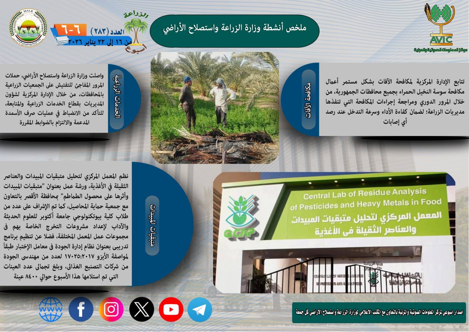 يذكر ان مركز المعلومات الصوتية والمرئية، والمكتب الاعلامي للوزارة، يصدران الجمعة من كل اسبوع، انفوجرافا وفيديو باسم: الزراعة في اسبوع، لالقاء الضوء على ملخص ما تم من انشطة وجهود، بكافة القطاعات والهيئات، التابعة للوزارة.