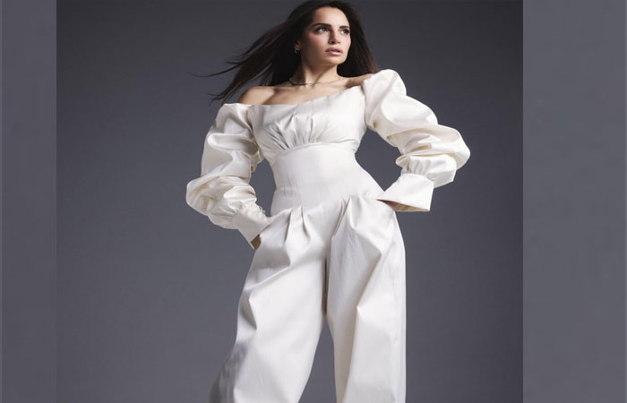 وجاء التصميم بقصة أنيقة، تميزت بأكمام منفوخة ولمسة أنثوية ناعمة، مع خصر محدد أبرز رشاقتها، كما اختارت بأن يكون البنطال واسع.