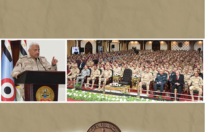 وألقى الفريق أول / عبد المجيد صقر القائد العام للقوات المسلحة وزير الدفاع والإنتاج الحربى كلمة نقل خلالها تحيات وتقدير السيد الرئيس / عبد الفتاح السيسى رئيس الجمهورية القائد الأعلى للقوات المسلحة وإعتزازه بالجهد الذى يبذله رجال القوات المسلحة فى صون مقدرات الوطن ، مؤكداً على ضرورة قيام القادة والضباط على كافة المستويات بالمحافظة على مستوى الإستعداد القتالى لوحداتهم والإهتمام بالمقاتلين بإعتبارهم الركيزة الأساسية لقواتنا المسلحة ليكونوا قادرين على تنفيذ مختلف المهام الموكلة إليهم بكفاءة وإتقان وروح معنوية عالية ، وكذلك أهمية التسلح بالوعى المستنير لما تشهده المرحلة الحالية من تحديات للحفاظ على أمن الوطن وسلامة أراضيه .