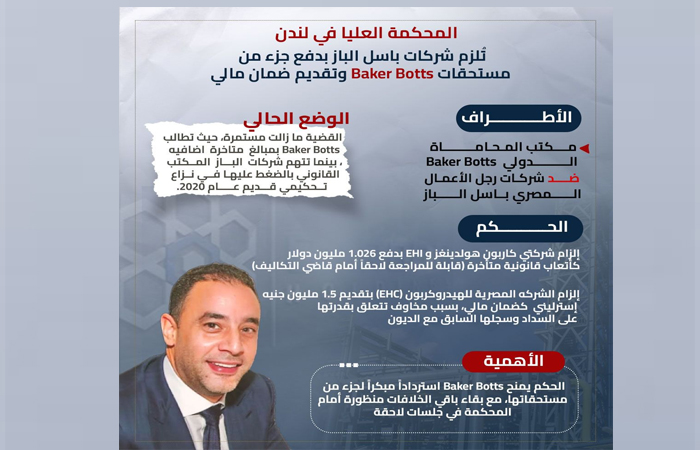 في تطور جديد في النزاع القضائي بين مجموعة شركات رجل الأعمال المصري باسل الباز وشركة المحاماة الدولية Baker Botts، أصدرت المحكمة العليا في لندن حكمًا لصالح الأخيرة، يقضي بإلزام الشركات التابعة للمجموعة بدفع مبالغ مالية كبيرة وتقديم ضمان للتكاليف القانونية.
