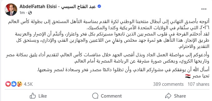 وقال السيسي، عبر حسابه الرسمي على “فيسبوك”: “أتوجه بأصدق التهاني إلى أبطال منتخبنا الوطني لكرة القدم بمناسبة التأهل المستحق إلى بطولة كأس العالم 2026، التي ستقام في الولايات المتحدة الأمريكية وكندا والمكسيك”.